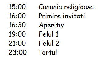 Cununia religioasă va avea loc la ora 15:00, urmată de petrecere începând cu ora 16:00